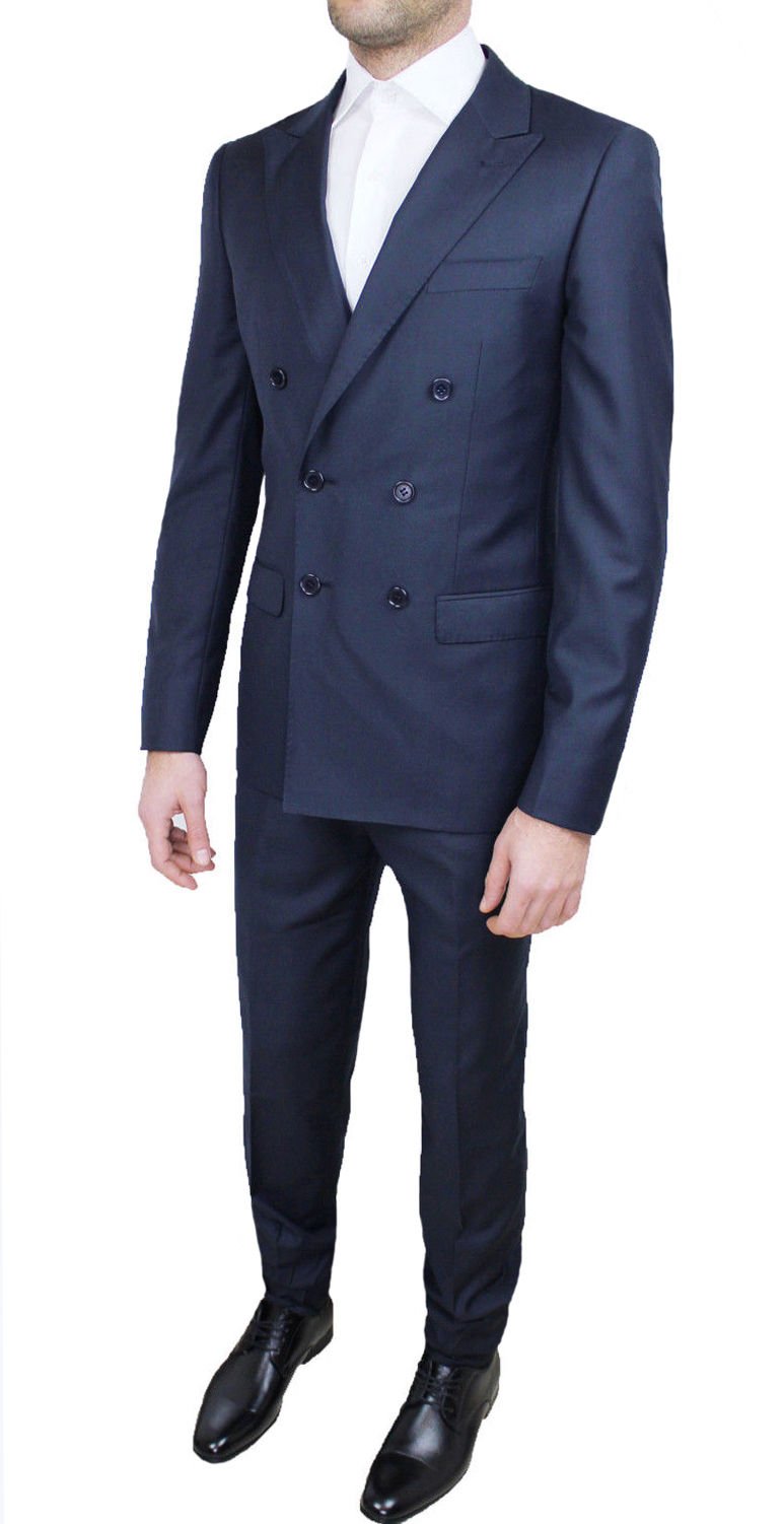 Abito completo uomo, giacca con pantaloni. Colore blu scuro navy, modello doppiopetto. Con tre tasche esterne e una interna. Doppio spacco sul retro. Foderato internamente. Interamente sartoriale, di altissima qualità e manifattura. Ideale per un look elegante e da cerimonia. Vestibilità normale, regolare.