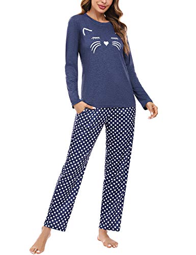 Aibrou Pigiama Donna Cotone Pigiami Donna Eleganti Pigiama da Donna Gatto Manica Lunga e Punto d’onda Pantalone Lungo per Notte Primavera e Autunno