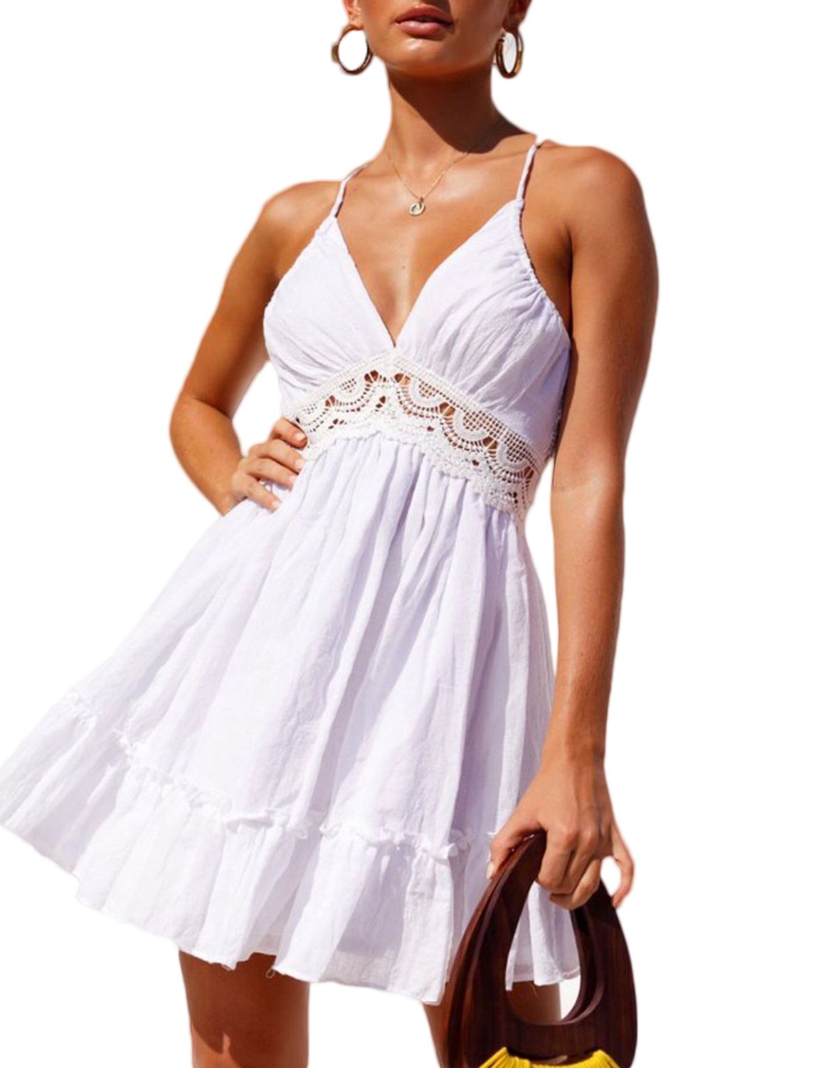 Donna Vestito con Pizzo Fantasia Senza Schienale Corto Abito da Sera Partito Banchetto Senza Maniche Mare Spiaggia Copricostume Mini Vestitino