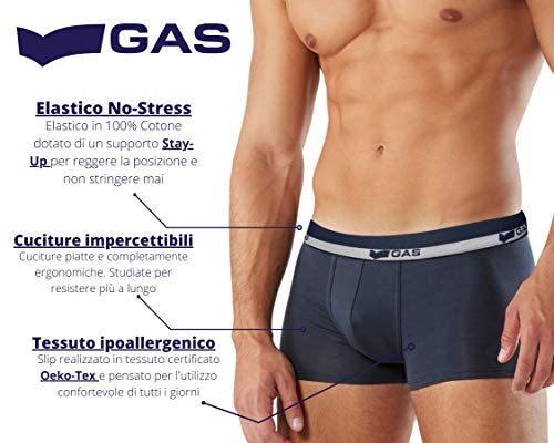 ✅COTONE EXTRA-FINE TRASPIRANTE: Boxer Realizzati con finissimo cotone di prima qualità. Frutto di un prodotto totalmente pensato in Italia. I Boxer GAS sono completamente traspiranti, progettati per prevenire la sudorazione ed essere adatti a tutte le stagioni. Adatti anche per lo Sport. La pelle rimane asciutta e senza irritazioni. Il tessuto composto da un’altissima percentuale di cotone (95%) risulta morbido e aderente al corpo senza mai dare fastidio. TOTALMENTE ERGONOMICI.