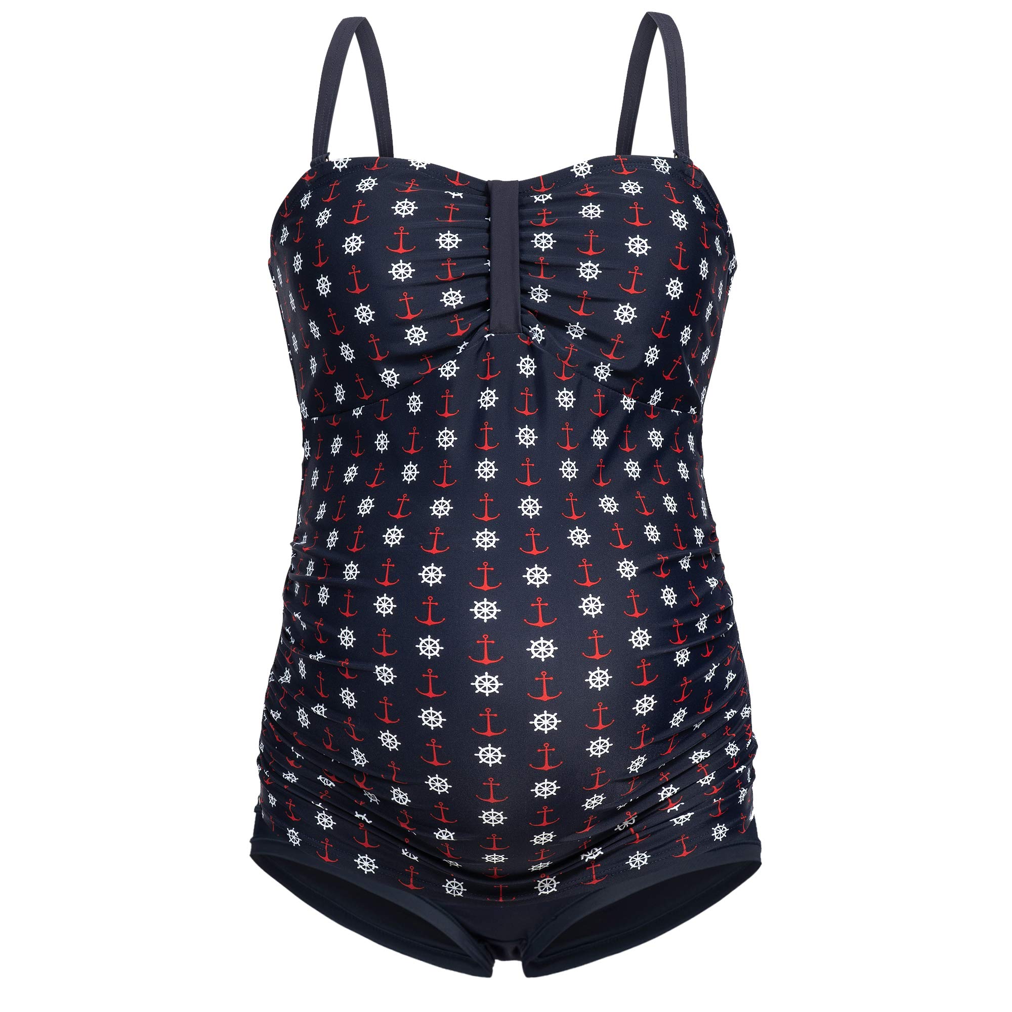 FIT: Grazie alle balze laterali, il tankini gravidanza si adatta perfettamente al pancione in crescita. Il bustier incorporato (coppe taglie B, C, D) mantiene il seno comodamente in forma (senza ferretto). Il tankini premaman è variabile grazie alle spalline removibili regolabili individualmente.