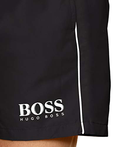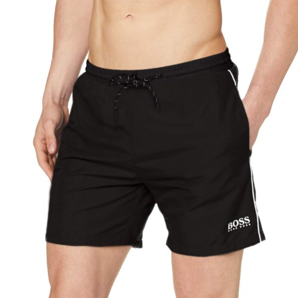 Boxer BOSS da bagno di lunghezza media realizzato in tessuto tecnico ad asciugatura rapida. Questo modello ha vita elasticizzata con cordoncino, etichetta stampata e finiture a contrasto.