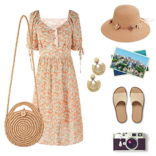 JOSEKO Borsa estiva, borsa tonda intrecciata in paglia, con sciarpa etnica, tracolla staccabile, adatta per viaggi di vacanza