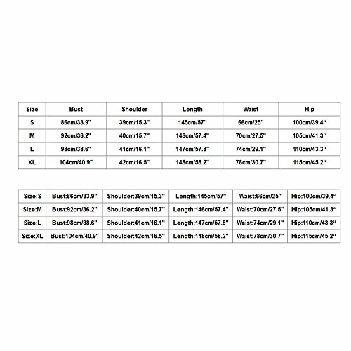 Taglia: S Busto: 86 cm / 33,9 “Spalla: 39 cm / 15,3” Lunghezza: 145 cm / 57 “Vita: 66 cm / 25” Anca: 100 cm / 39,4 “Taglia: M Busto: 92 cm / 36,2 “Spalla: 40 cm / 15,7” Lunghezza: 146 cm / 57,4 “Vita: 70 cm / 27,5” Anca: 105 cm / 41,3 “Taglia: L Busto: 98 cm / 38,6 “Spalla: 41 cm / 16,1” Lunghezza: 147 cm / 57,8 “Vita: 74 cm / 29,1” Anca: 110 cm / 43,3 “Taglia: XLBusto : 104cm / 40.9 “Spalla: 42cm / 16.5” Lunghezza: 148cm / 58.2 “Vita: 78cm / 30.7″ Anca: 115cm / 45.2 ” —–Pacchetto incluso: 1 x Jumpsuit Donna—–Tatto della mano molle, comodo da indossare.—–Lavare a mano/macchina/appendere a secco.—–Ottimo per festa, cocktail, Club, vacanza, serata fuori—–Tessuto confortevole, tuta sexy—–Outfit perfetto per l’abbigliamento casual, estivo e autunnale di primavera.—–Occasione: vestito per casual outdoor, festa, cocktail, sera, Club, matrimonio, vacanza, spiaggia, vita quotidiana.