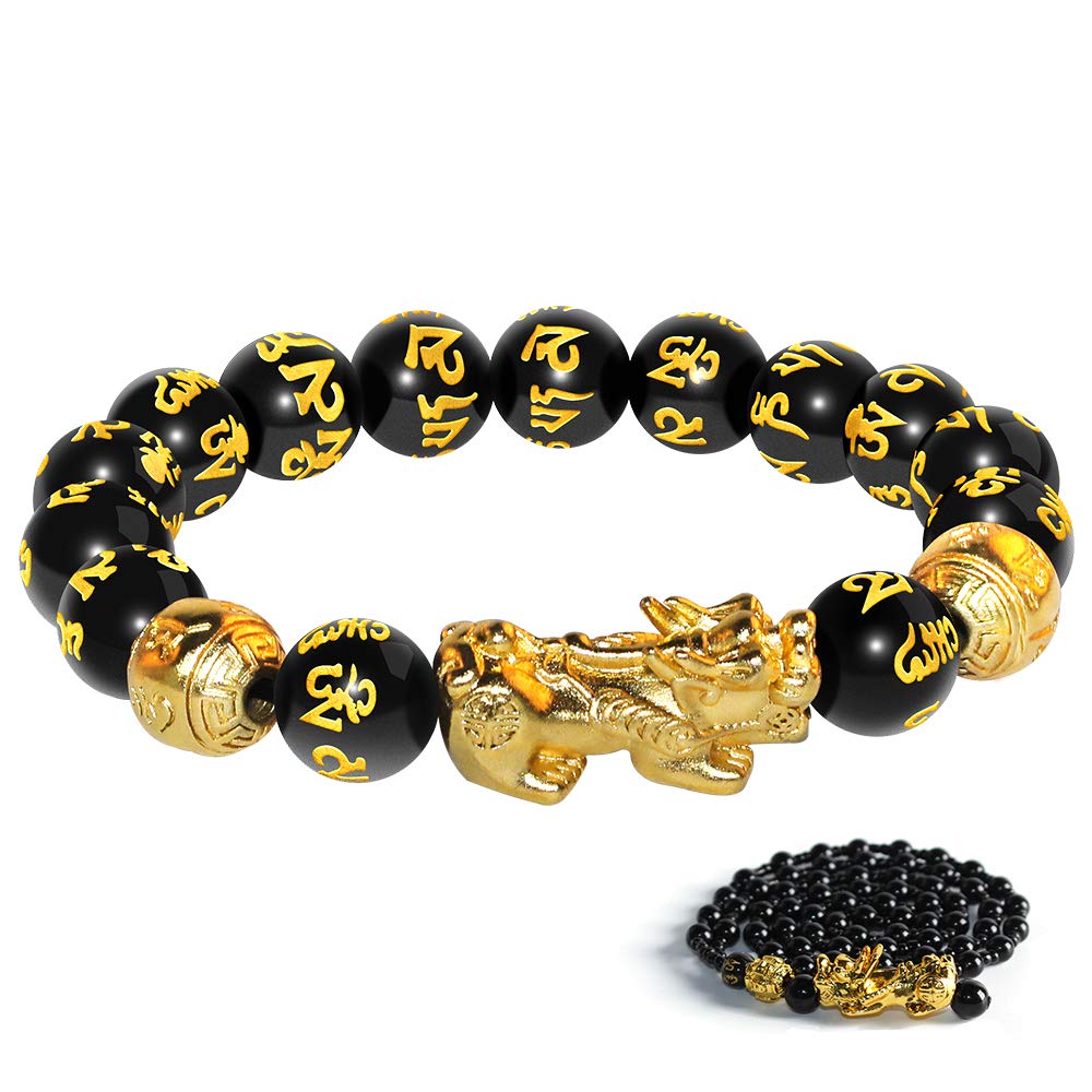 Katomi – Braccialetto cinese con perline Feng Shui, colore nero, con Pi Xiu, in ossidiana, con amuleto intagliato a mano, per fortuna e ricchezza