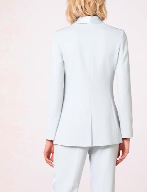 Disegnato con doppiopetto, collo sciallato e tasca con patta