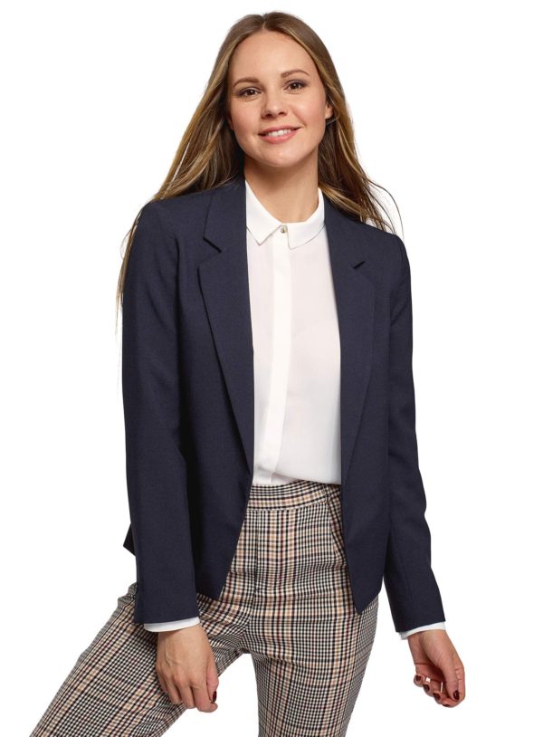 Blazer dalla linea pulita con revers stretti e bottoni sulle maniche. La giacca in tessuto morbido, stretta in vita sottolinea la figura. Il blazer senza chiusura è adatto sia per il guardaroba business che casual o da sera. Abbinabile perfettamente con magliette e jeans o vestiti e sandali. Una giacca elegante per diverse situazioni!