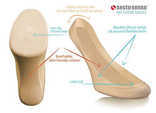 Low-cut, forma della scarpa, design unico – calze invisibili con comfort super-morbido e grande capacità di assorbire il sudore. Le calze SESTO SENSO sono la soluzione perfetta per chi apprezza il comfort. Le calze sono realizzate in cotone (parte inferiore) e la parte superiore è realizzata con una miscela di tessuti. Doppio strato di silicone sull’intero bordo (il polsino elastico offre il comfort dei calzini corti) e un triplo strato sul tallone che mantiene le calze in posizione perfetta per tutto il giorno. Grazie all’innovativa tecnologia antiscivolo con siliconi, le calze non scivolano se indossate e sono molto confortevoli sul tallone – cerchio in gel di silicone (nella forma del logo SESTO SENSO) per tenerle saldamente sul collo del piede e sul tallone. Le calze di SESTO SENSO sono esattamente quelle calze invisibili che stavi cercando. I piedi si adattano molto bene ai tuoi piedi. Perfetto per l’uso quotidiano o per le occasioni speciali. I calzini sono invisibili quando si indossano le scarpe. Elastici calzini comodi perfetti per ballerine o scarpe da ballo, pumps, scarpe con tacchi alti, sneakers, scarpe piatte, scarpe da barca, mocassini. I bottini invisibili saranno perfetti per le tue ballerine, scarpe da ginnastica, mocassini e altre scarpe estive. Le calze di SESTO SENSO sono disponibili in due taglie europee: 35-38 e 39-41; in tre colori: beige, nero e bianco. Le calze invisibili sono elastiche per adattarsi ai piedi della maggior parte delle donne e delle ragazze.