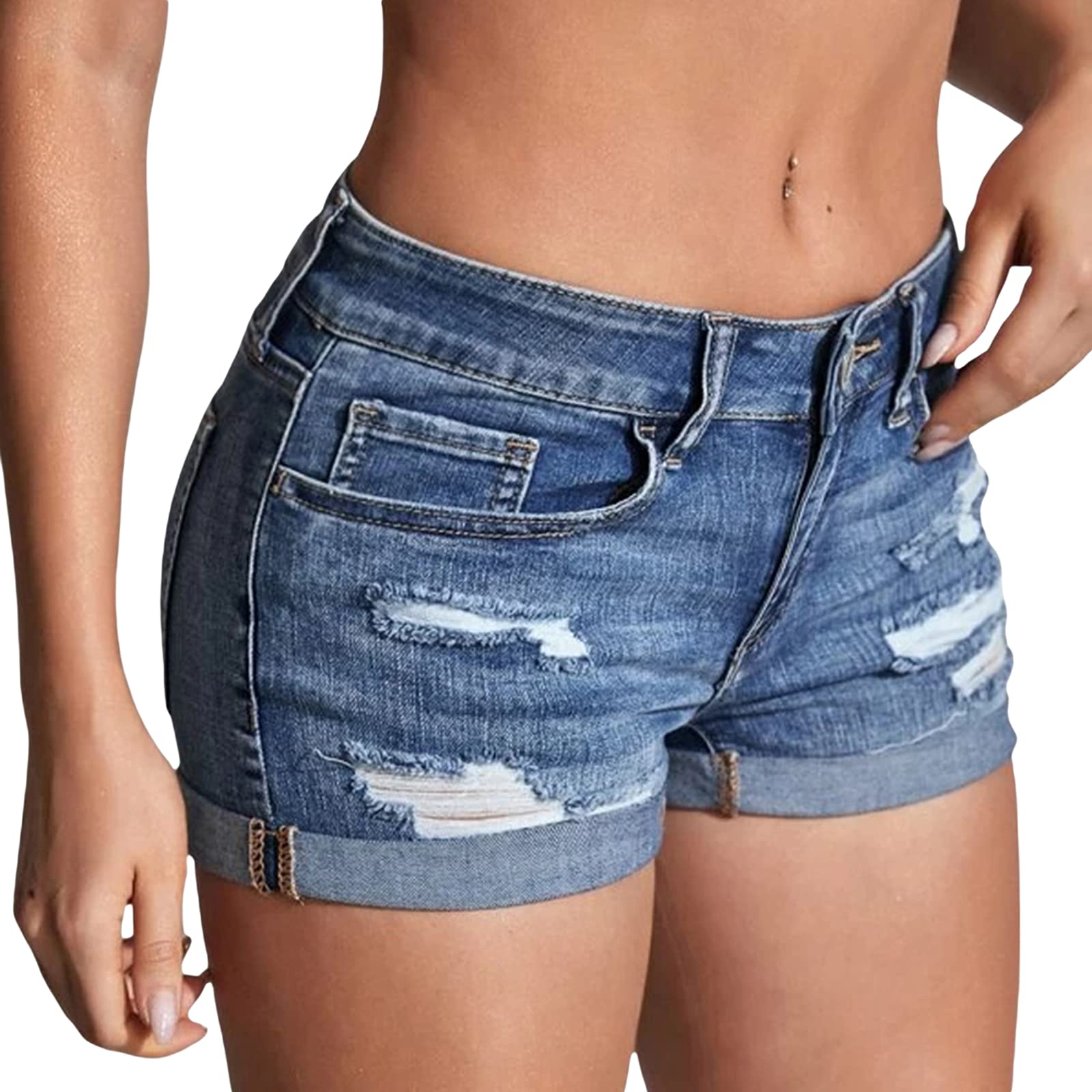 Caratteristica: vita media, patta con zip con chiusura a bottone, vestibilità slim, con tasche, fori strappati, polsini arrotolati, elasticizzato, lunghezza sopra il ginocchio, mini corto, pantaloncini tagliati alla moda, classico colore denim versatile. due pantaloncini con tasche laterali, pantaloncini caldi casuali a vita alta.
