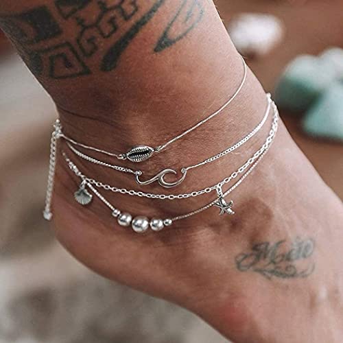 Ushiny Boho – Cavigliera a strati con stelle marine, in argento, per donne e ragazze (4 pezzi)