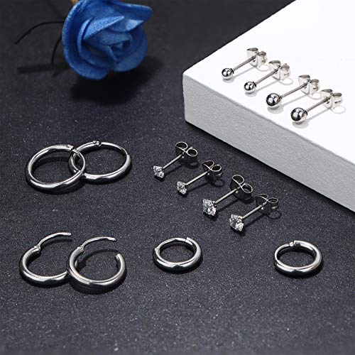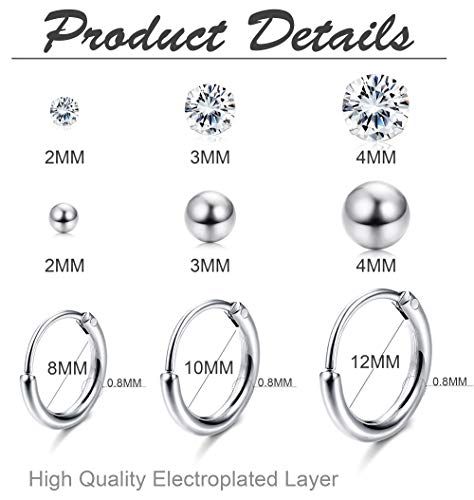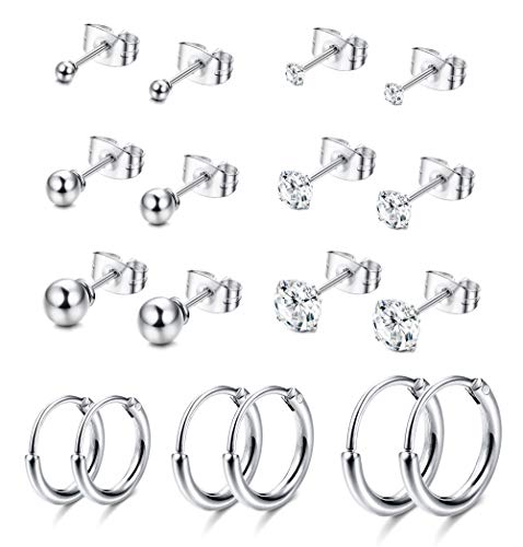 YADOCA 9 Paia Orecchini in Acciaio Inossidabile per Donna Uomo Cubic Zirconia Rotondo Piccolo Palla Cerchio Orecchini Set